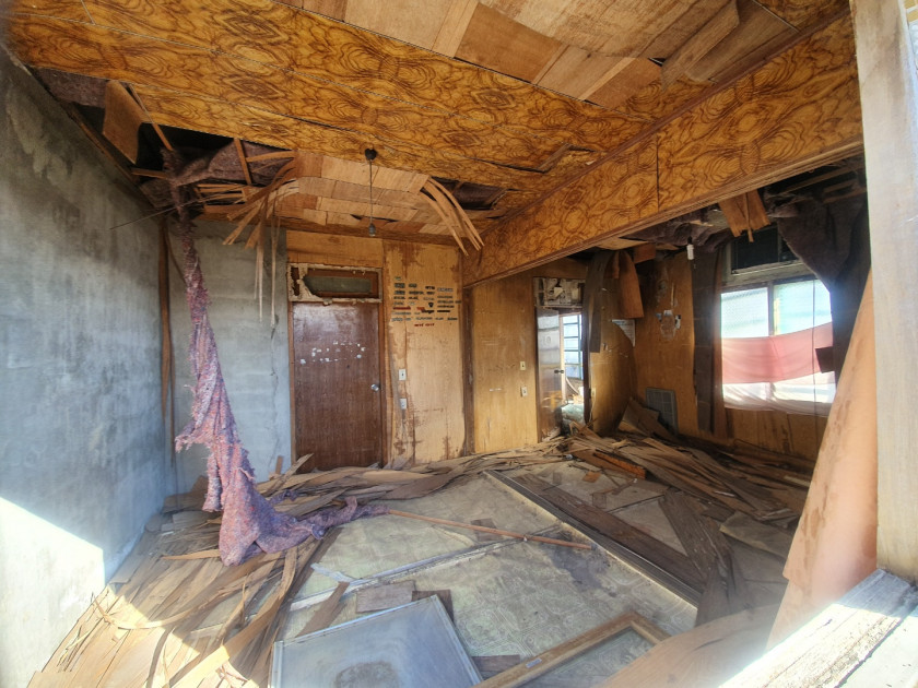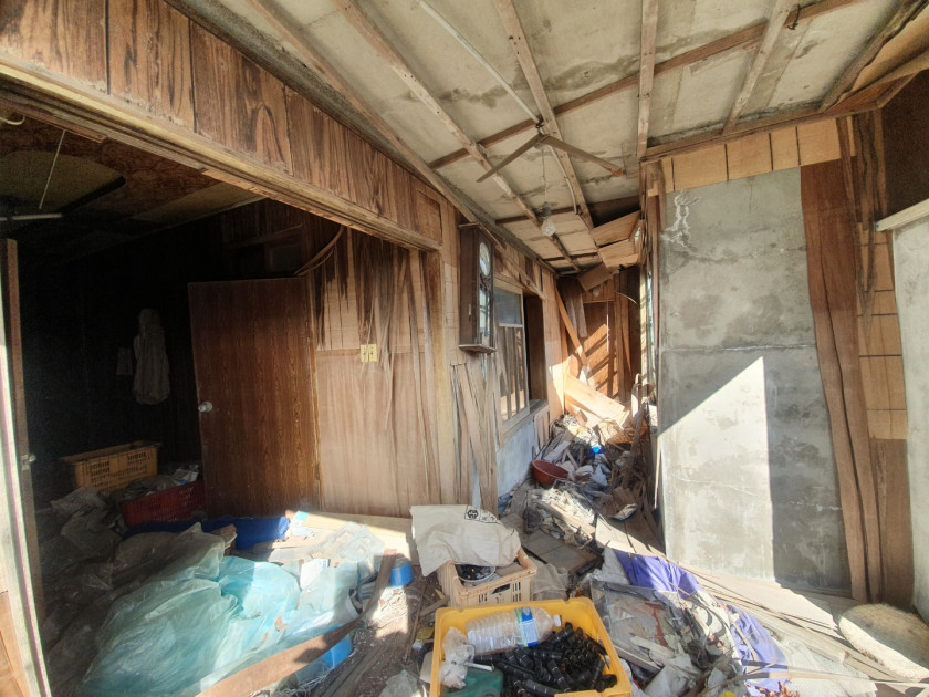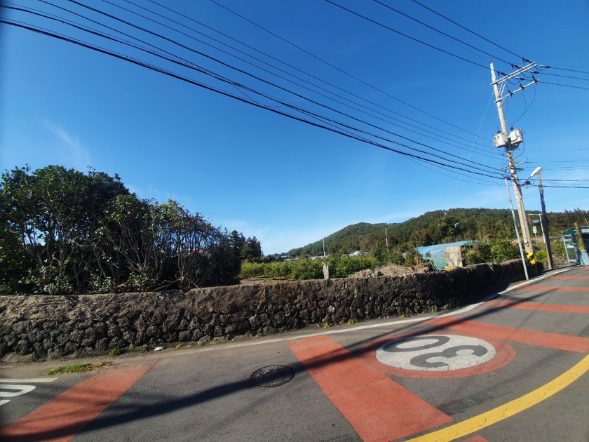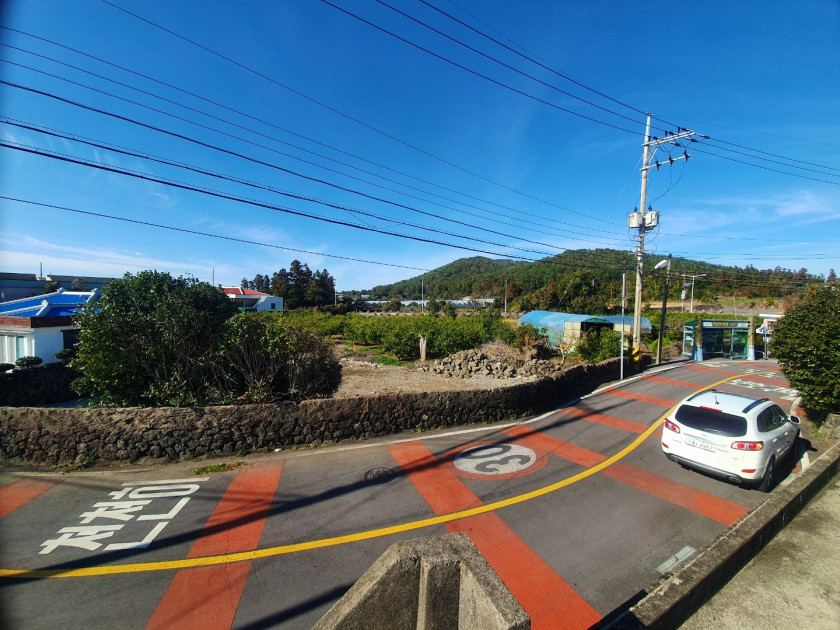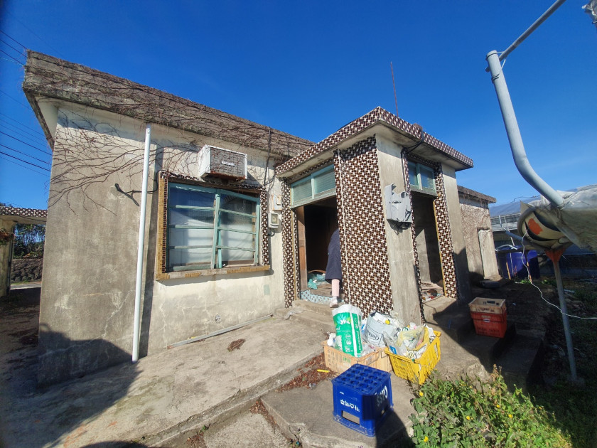 마을길 2차선에 접해 있으며, 전면에는 창고 형태로 되어 있고, 창고 뒤에 오래된 주택, 그 뒤에 귤 하우스입니다.